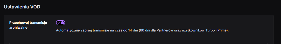 Ustawienia > Transmisja > sekcja Ustawienia VOD > Przechowuj transmisje archiwalne