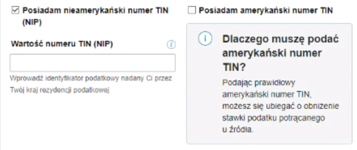 Należy wybrać opcję “Posiadam nieamerykański numer TIN (NIP)” a w “Wartość numeru TIN (NIP)” trzeba wpisać nic innego niż nasz PESEL.