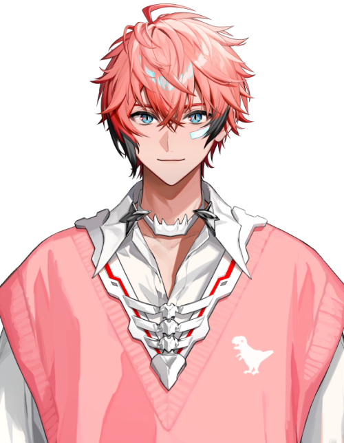 He has short pink hair with black streaks and light blue eyes. He has a white bandage on his cheek. He has a pink sweater vest with white dinosaur graphic and red shoes.