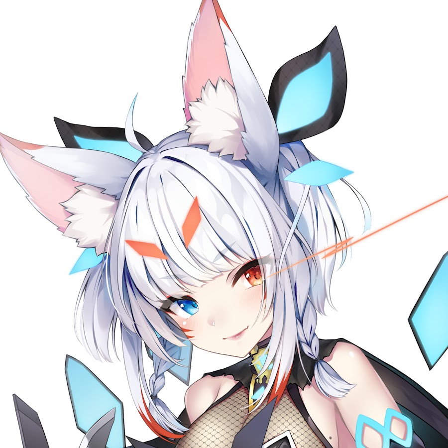 Kinoko looks like a girl with white hair and fur, as well as wolf ears and tail. She has heterochromia; her left eye is red, while the right is blue.