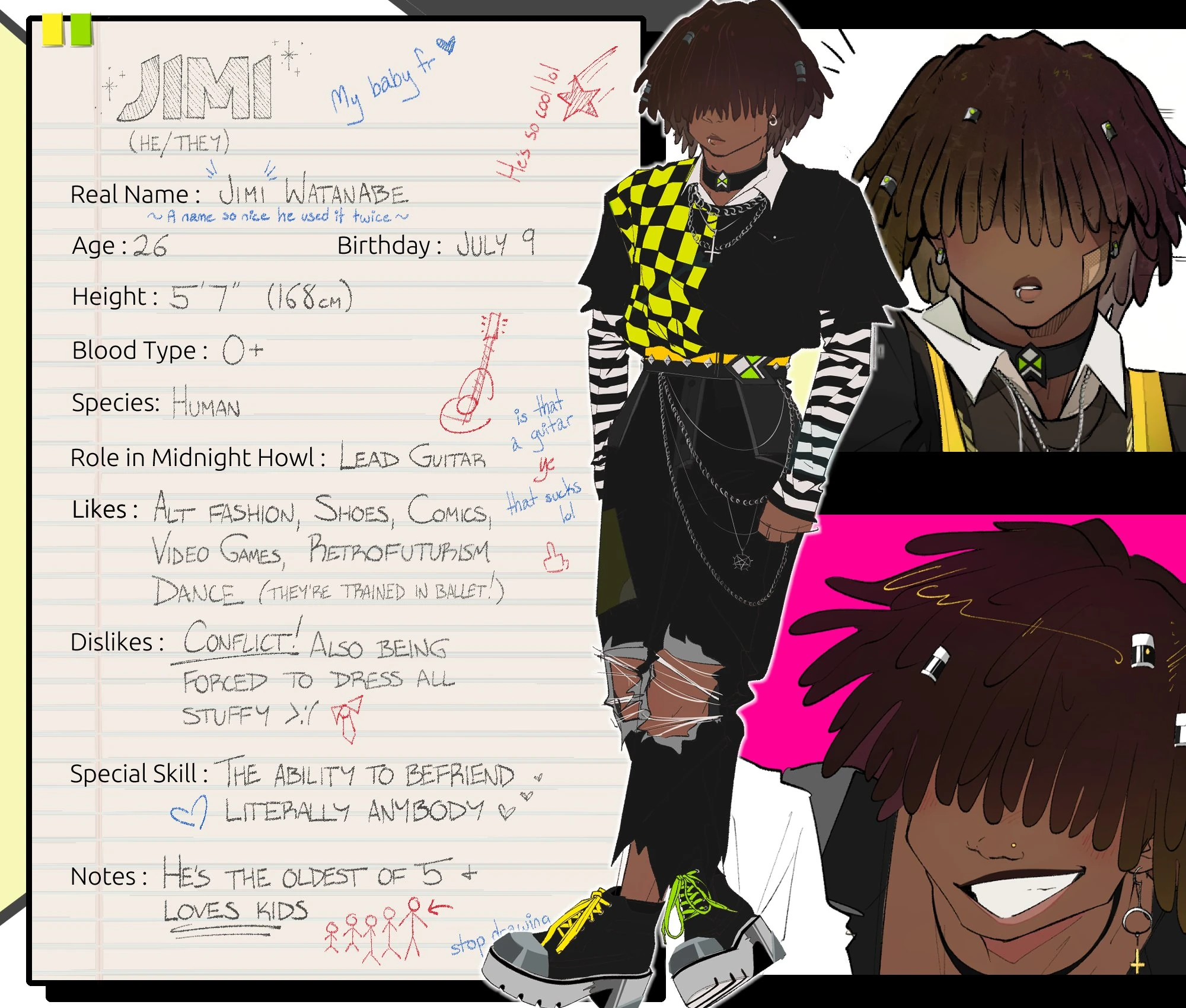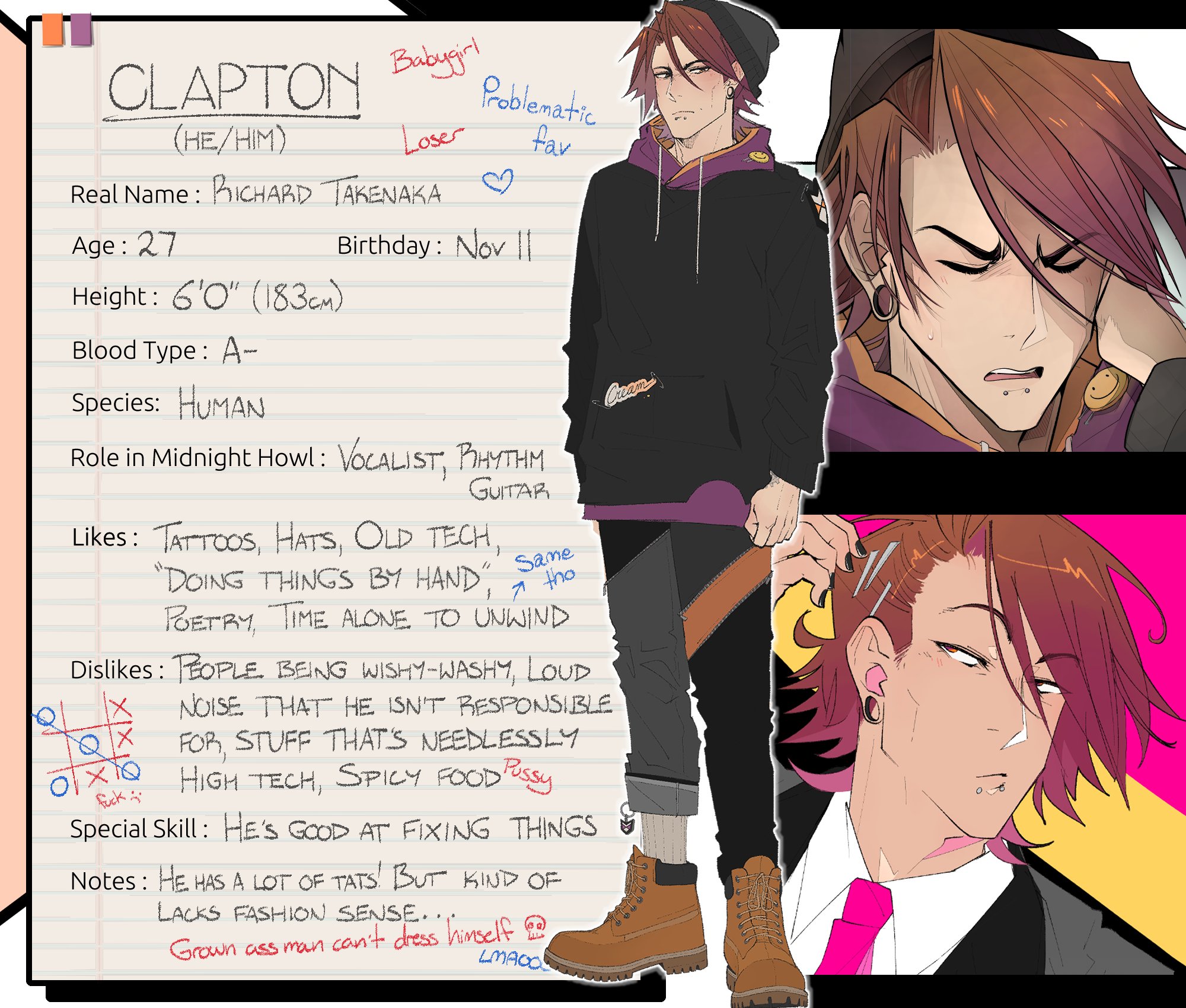 - His favourite foods are takoyaki, cherry soda, hot dogs, [REDACTED], karaage, and "BLUE RASPBERRY ANYTHING."