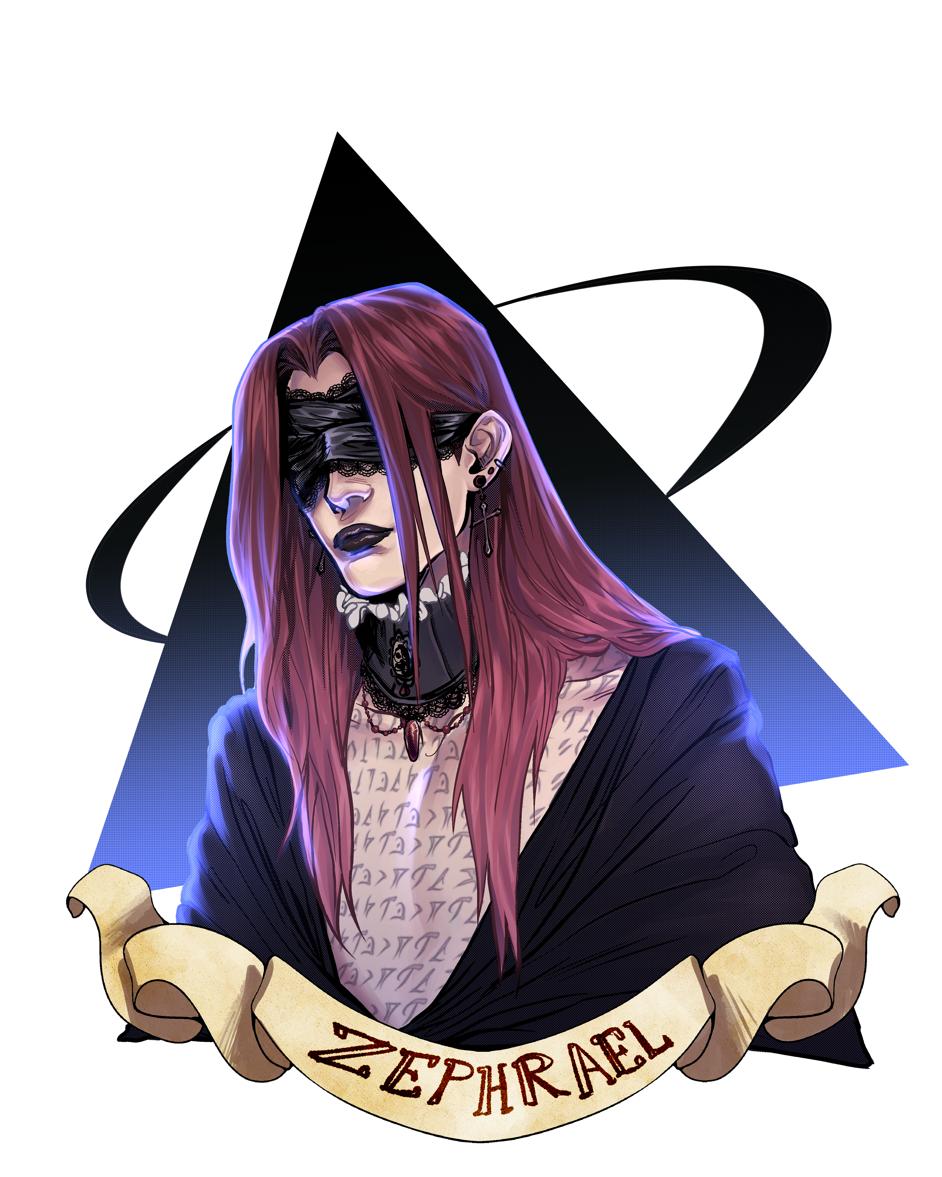 Alpha has dark purple hair (he has described it as "Raven coloured") with pink lowlights in a ponytail bun, a beauty mark, pink and teal eyes with an eye scar, a cybernetic arm, and multiple tattoos.