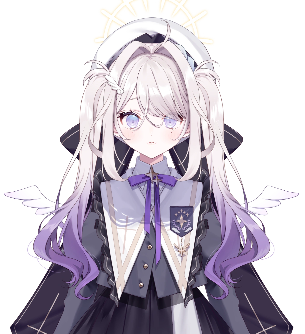 She has wavy white pigtails that turns to purple at the ends and light purple eyes with a single winged hairclip.