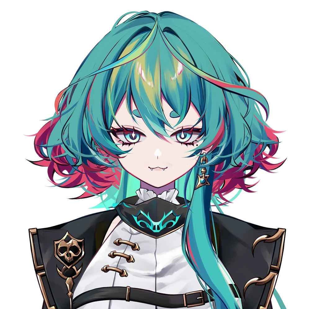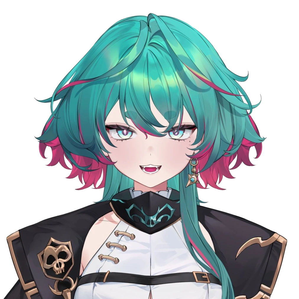 Amaya has messy green hair with crimson tips. One long hair bang falls on her left front side, while two more go down her back. Her eyebrows are tiny and round. She has fangs and a tongue piercing. Her eyes are blue with retinas with different shapes: her right one looks a diamond, and her left one like a droplet. She has three moles: one below her left eye, one over her left boob, and one over her left knee. On her left ear hangs up a dagger-like earring. She wears elegant clothes: white shirt without sleeves, black jacket, black short pants, and black boots. A belt falls with some flasks hangs up by her right side.