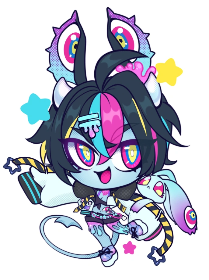 She is a shapeshifting demon girl who has black hair with multicolored highlights, eyes with multicolored irises, a pair of white horns, strange animal ears with eyes, and light blue skin.