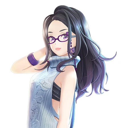 She has long, straight dark purple hair parted to show her forehead and purple eyes and glasses.