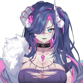 She's a dragonoid with two horns, one of which is broken, two dragon-like wings with spikes and lots of torn holes and a thin spine-like tail, with everything being in white and pink color pallete. She has purple and pink wavy hair and cyan eyes. She also has pointy teeth and cyan tongue.