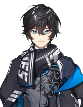 He has short black hair with a slight tousled look and a lighter dark blue shade at some parts of the edges with light blue eyes. He wears a mostly dark grey uniform with blue accents.