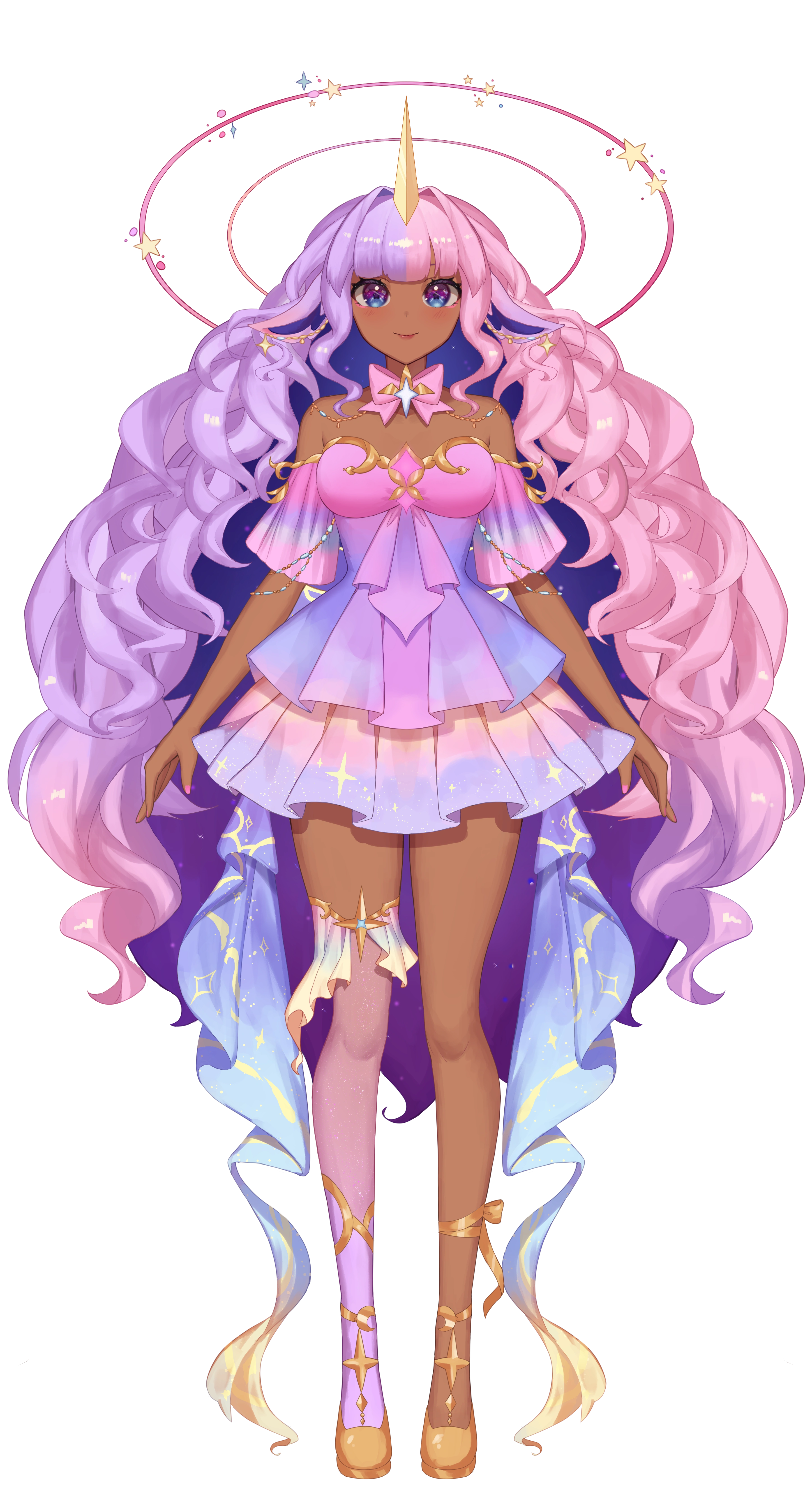 She has very long, wavy two-toned pastel purple and pink hair that has dark spacey blue underneath with a horn. And blue eyes with dark skin. Her dress is a ruffly pink and purple hair with sparkles.