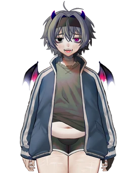 Bermuda is a somewhat short, chubby femboy with heterochromia eyes, his right being solid black and the left being hot pink with a blue rim. He wears a black headband, and has short, messy grey-blue hair. He wears a blue tracksuit, sloppy grey sweatshirt, black shorts. He has a pair of small dark blue and pink wings, small black and blue horns with a pink outline, and a black demon tail with pink outline. He wears an arthritis glove on his left hand. He has scarring on his thighs and arms, and bruising around his neck. He has barefeet. He is able to take his tracksuit jacket off, and sometimes wears a red dog collar and chain.