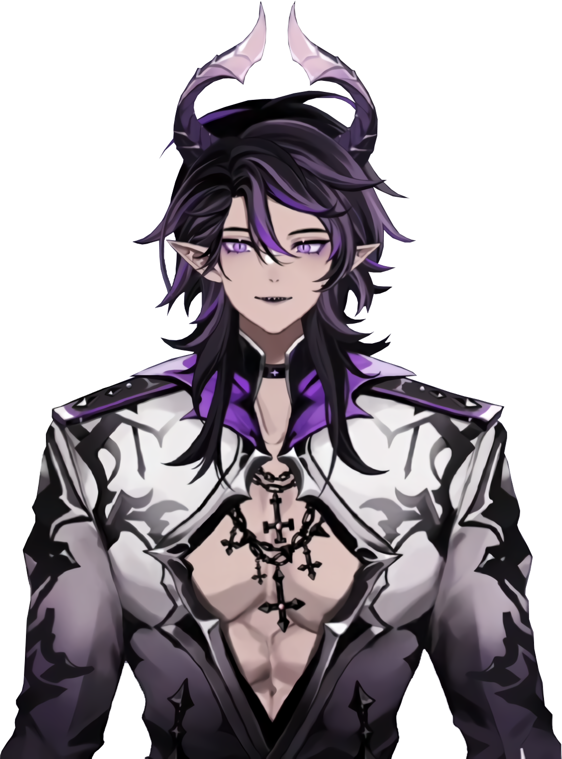 He has medium length black and purple hair and eyes with sharp purple horns protruding.