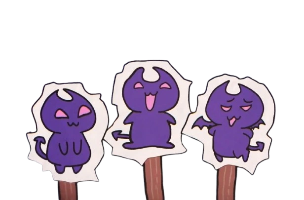 She has pointed ears with metallic white stud piercings in them. Black bat wings jut out of each side of her head, with two holes in each one. To the side of each wing, she wears diamond-shaped hairbands, with the right hairband being white and the left hairband black.