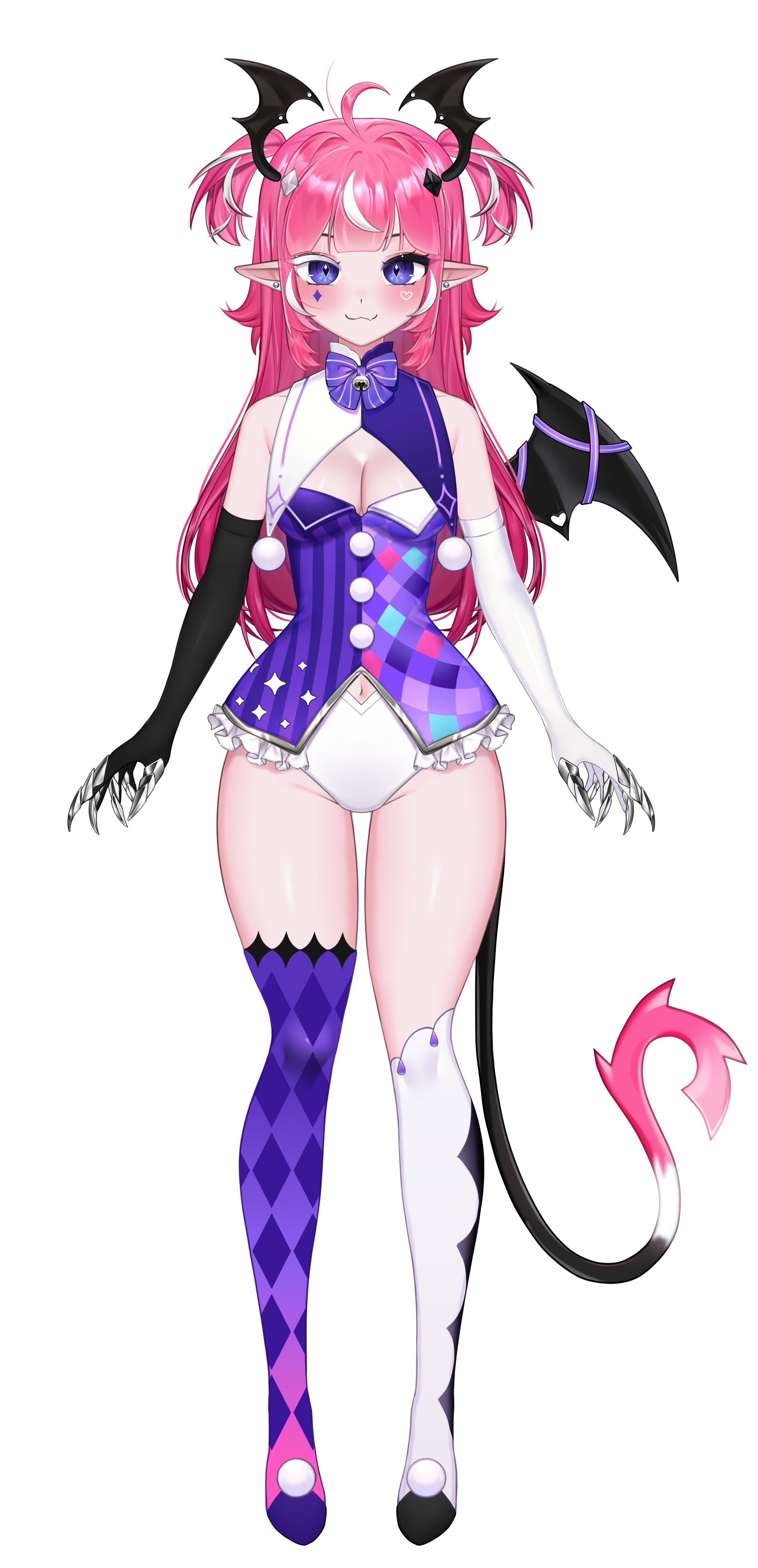 She has a single black bat wing on her back, wrapped in a purple cord. It has a heart-shaped hole in it. She also has a furry tail, most of which is black. Near the end of the tail, it turns to white and then pink, with the pink part being spiked.