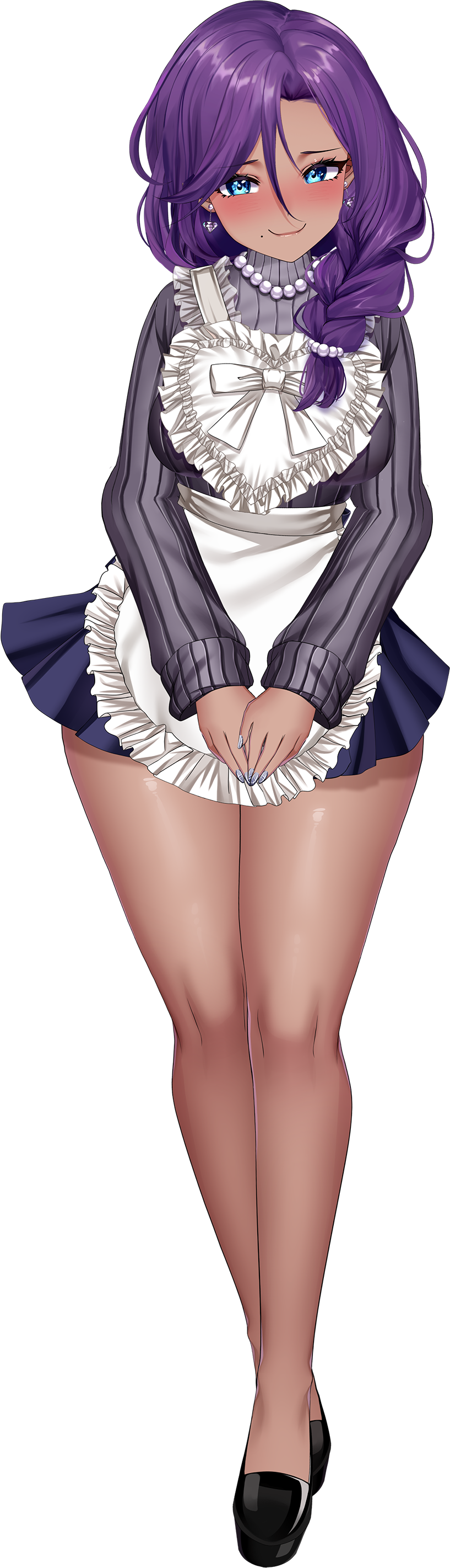Cha Cha is a brown-skinned, purple-haired woman with blue eyes and curvy feminine features. Her thick over-the-shoulder braid evokes stereotypical anime mom hair, and she has a beauty mark on her right cheek near the lips.