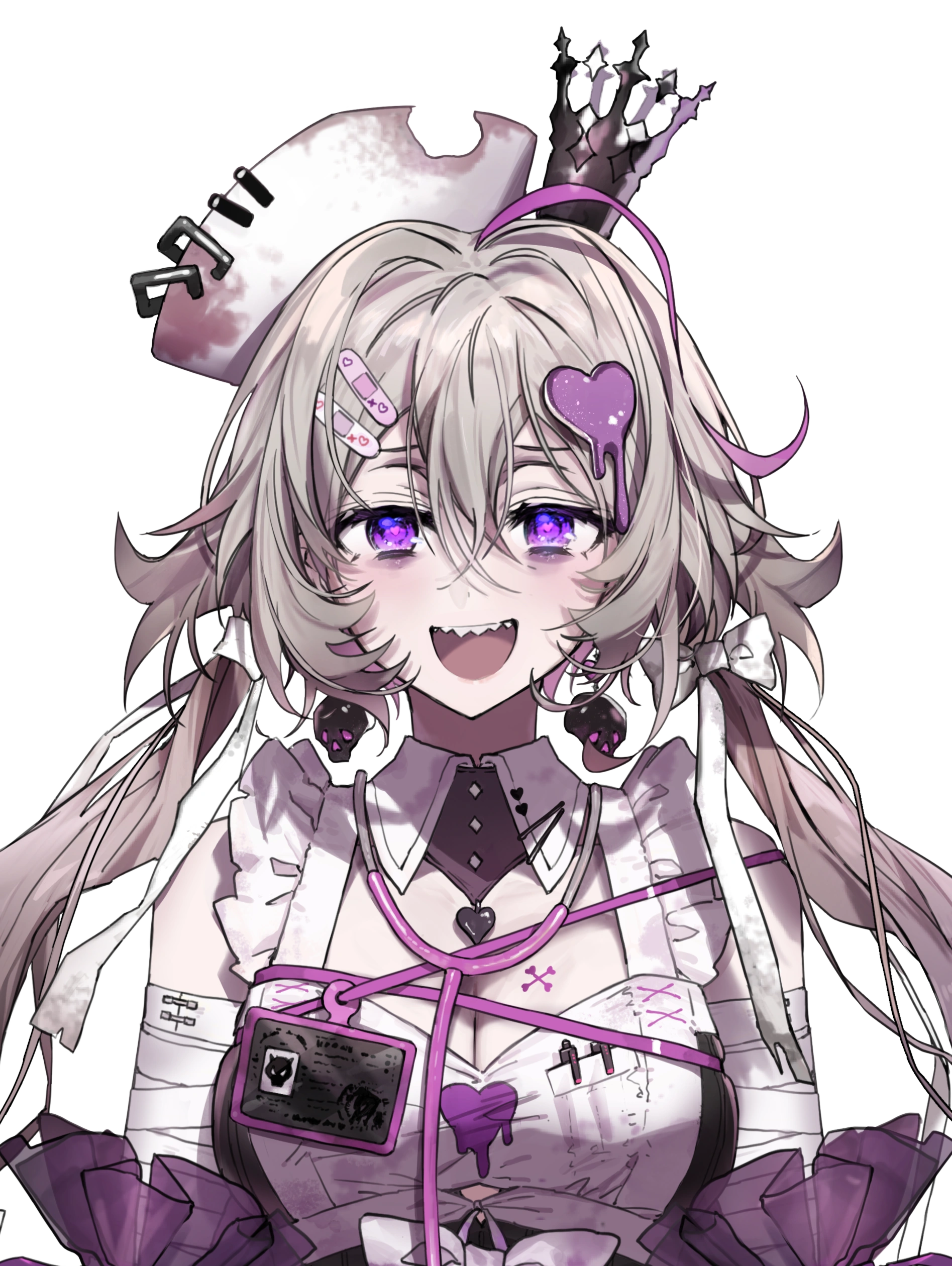 She has long, messy beige hair in twintails and bright violet-pink eyes with sharp fangs. She has two bandaid shaped hair clips and a 'melty heart' accessory with a slightly tattered nurse hat and black crown.