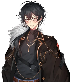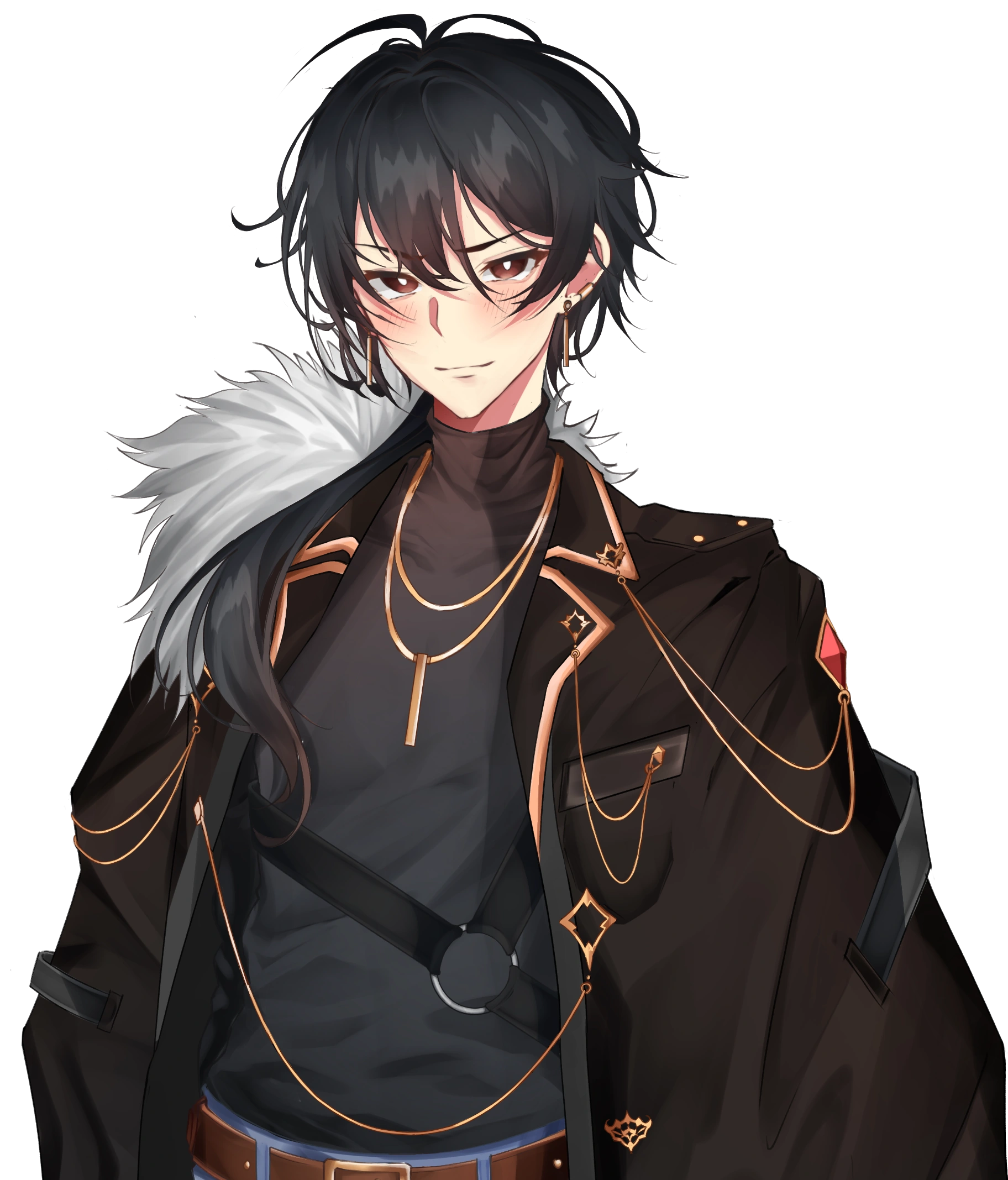 He has pale skin with black hair in a single ponytail with earrings and light brown eyes.