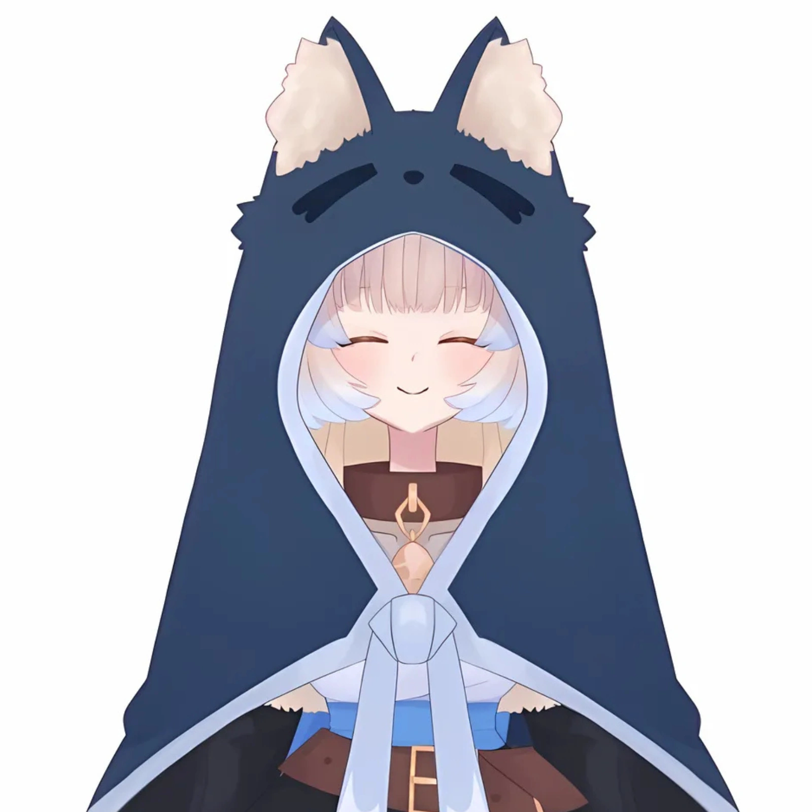She wears a white and blue bodice-like strapless top, with semi translucent part over the collarbones, which is partly hidden under her large leather choker with a bell attached. The sleeves of her outfit are detached and large, mainly black in color, having outside fur lining at the top and white lining at their widest point over her hands at the bottom. Her skirt is thigh-long and black, with cream lining on the inside and cross-like details on the edges. Her waist is wrapped around by a large leather belt with a golden buckle. On the back, a large bunch of her hair is tied onto her belt, imitating a large, wolf tail, hanging just next to her small, fluffy sheep tail. The connection of the belt and the imitation tail is hidden under a huge blue ribbon, fading in a gradient into black or white, depending on the end. She wears two mismatched socks - one blue stocking and one white sock, above which she has her thigh strapped with a small belt. On her feet are simple brown boots with a slight heel. She also owns a navy blue hoodie, imitating a wolf's skin, which is equipped with large wolfish fur-lined ears, canine wolf markings as well as tattered ends, suggesting rough past of the piece of clothing.