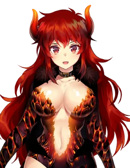 She has long wavy vibrant red hair and dark fiery red horns that has orange tips with dark pinkish eyes. Her outfit shows off her large cleavage and a lava-like texture/color scheme.
