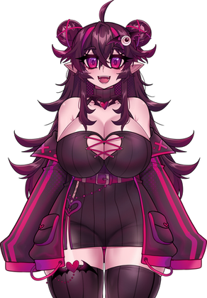 She has long, dark black hair with hair buns and streaks of reddish-hot pink. Her ears are pointed and she has sharp reddish eyes.