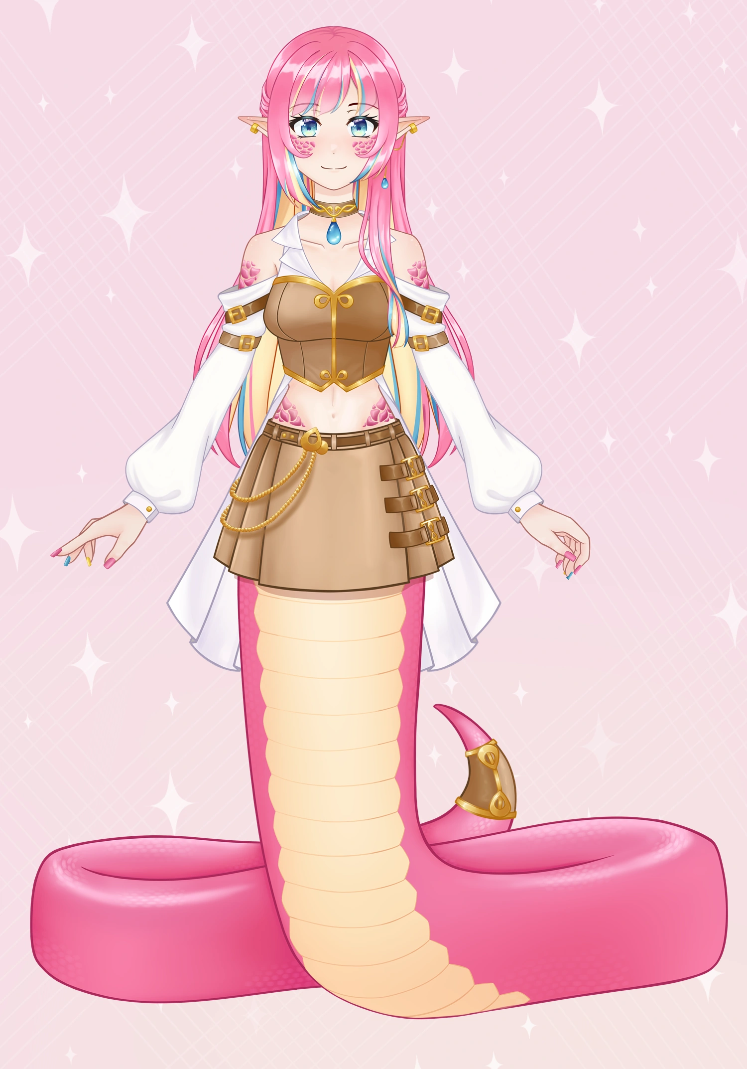 As a lamia, she has a human body up until her waist, at which point the rest of her body is that of a snake. Her skin is peachy white and her eyes are blue. Her hair is long and mostly straight, but increases in volume a bit at the tips; and it's pink on the outside but blonde on the inside, with yellow, blue and pink strands. Her fingernails are also painted in this three colors. Her tail is pink, while her abdominal scales are light yellow. She has patches of scales in her shoulders and cheeks. Her ears are long and pointed, and almost horizontal.
