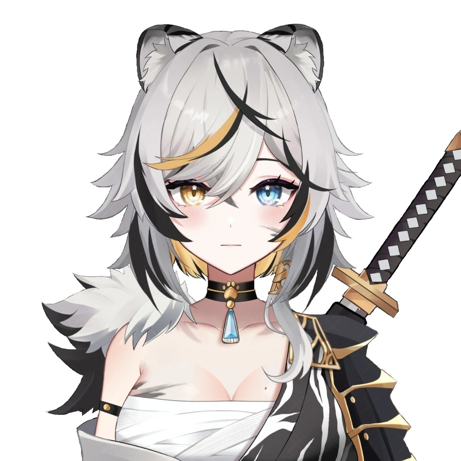 She has short silvery hair with black and blonde streaks and tiger ears. Her eyes are heterochromatic with blue and yellow. She has a black collar with gold pawprint in the center with a blue triangular charm attached. She has markings on her skin similar to tiger stripes, including on her left cheek, and also has a tail.