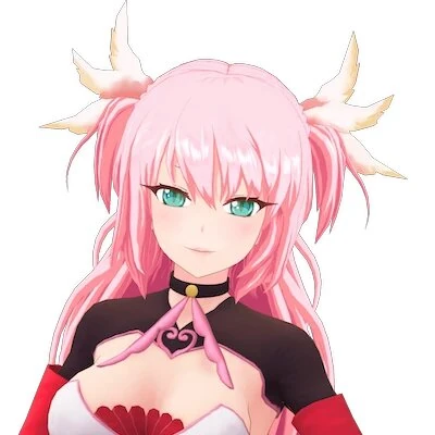 Fairys has long pink hair and eyes with teal irises. She wears a red dress with long-sleeved white feathers and wings on her head and an ornate red necklace.