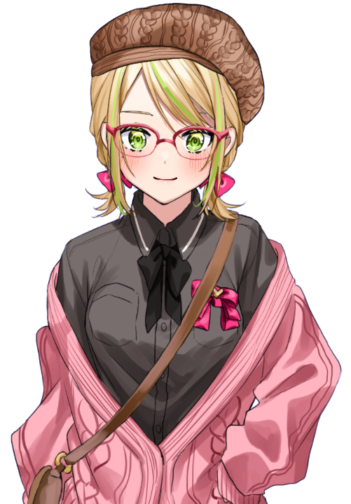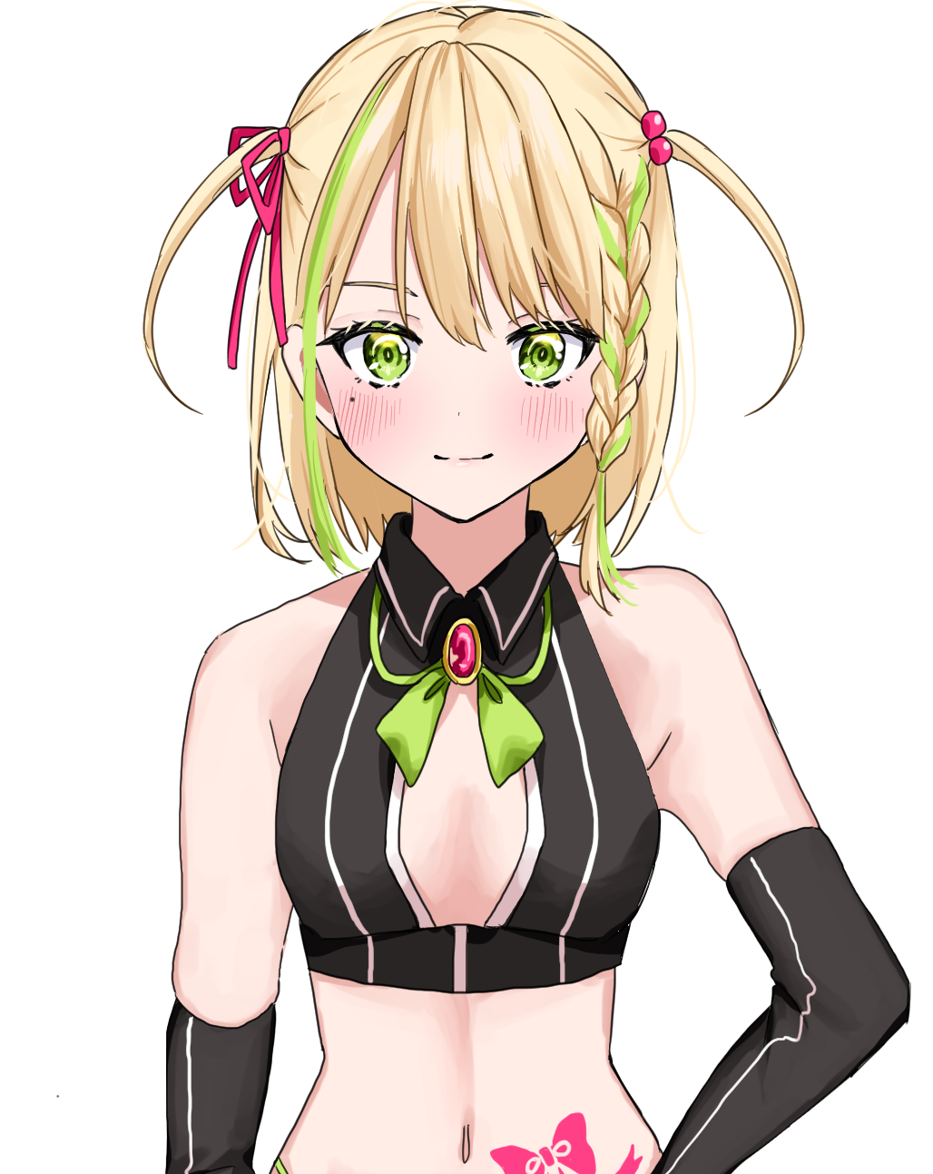 Miki has short blonde hair with two half-up twintails, bangs sweeping across the left side of her face and a braid on the same side. The braid and part of her right hair have vibrant green highlights. Her eyes are the same vibrant shade of green. She has a beauty mark under her left eye, which she she considers a charm point.[1]