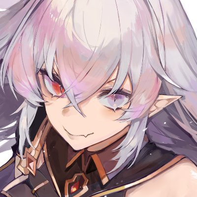 GEEGA features long, silvery hair with an ahoge, pointed ears, and fangs. Her eyes are uniquely colored, with one being light red and the other light purple, both having slit pupils.