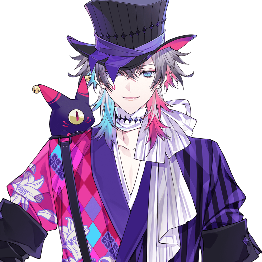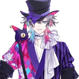 His hair is silvery and medium length with two-toned pink and blue streaks near the bottom. He wears a dark purple jester-like top hat and white scarf with diamond patterns around the neck area.