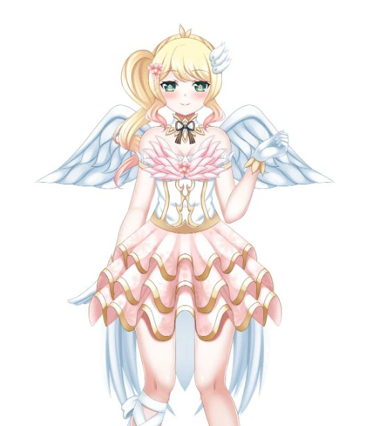 She has blonde hair with a wavy side ponytail and light green eyes with a small pink flower accessory and white wings.