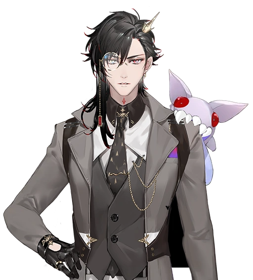 He has long black hair with specks of red throughout and a monocle with a light violet eye.