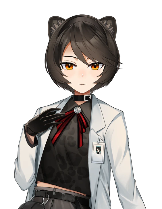 She has short dark hair with animal ears, tail and orange eyes. She wears a black leopard print top with white lab coat with a keycard of her ID/photo attached and red and black ribbon on her neck with a white button and a black skirt.
