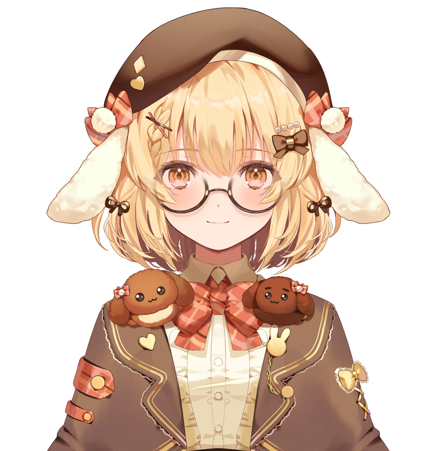 On 1 April, Haneru debuted her tenth 2D costume as her new main costume. Haneru has a brand new art style, including both her physical features and clothes designed by Kanda Done. While this is a brand new model, 774 inc. officially considers it her tenth costume. Haneru's hair has more volume and a different shade of yellow, she has a braid to the side. Her rabbit ears seem to be fake, being part of her beret. She uses a brown beret, with checkered red ribbons and white pompoms and multiple hairpins and various hairpins. She wears dark brown frame glasses. Haneru wears a white blouse with frills with wide sleeves with a pattern and cuffs tied by yellow ribbons. On top of it, Haneru can wear a brown cape with golden assets and frills in the edges. Her mascots Mugi-chan and Kina-chan are on top of her shoulders. She has a brown corset. Haneru uses a wide, brown skirt with two cuts to the sides with a red checkered pattern, decorated with golden diamonds, hearts, and ribbons. Her socks are see-through, brown socks with prints of carrots and bunnies. Her shoes are brown.[31]