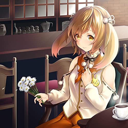She has medium length sandy blonde hair with golden eyes and floppy rabbit ears. She has an orange and white polka dot ascot with long sleeved white top and an ankle-length orange skirt and a large golden bunny head badge with her name written on it in hiragana.