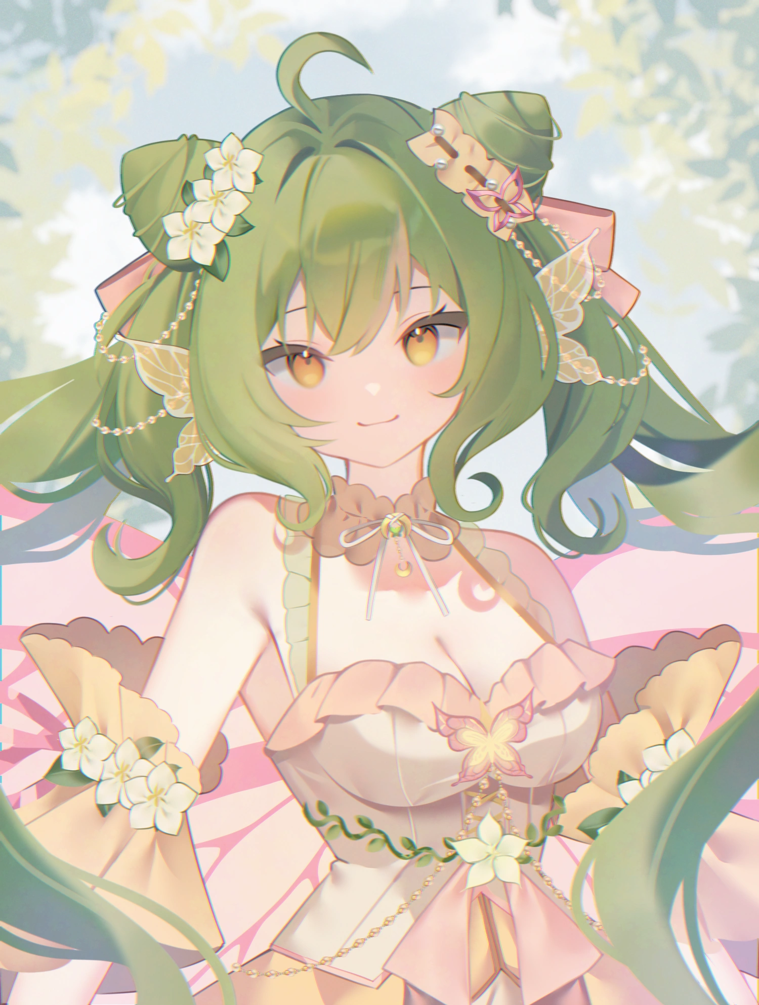 Inanna has very long, light green matcha colored hair work in wavy twintails with her signature triangular buns. She has glowing gold eyes and butterfly-wing ears. Her bangs are slightly swept to the left, with a streak of light pink. Inanna typically wears a flowy yellow dress with cream-colored frills and various butterfly-wing accessories. Her hair and clothes are also adorned with moonflowers.