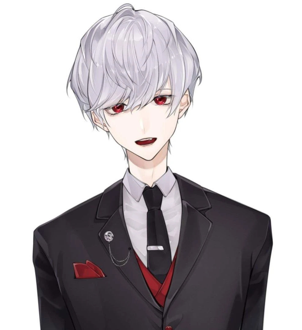 He has short white hair and red eyes and a black suit.