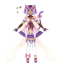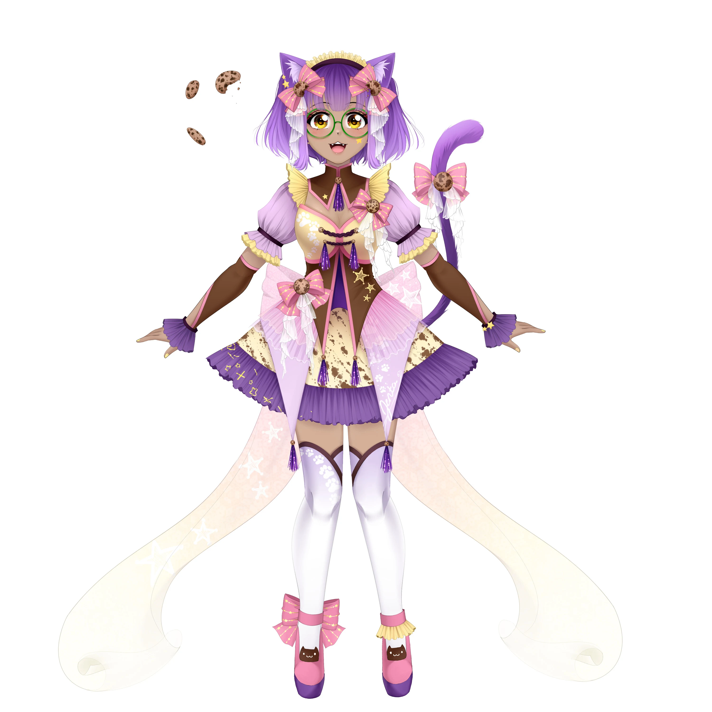 She has short, purple hair with cat ears, cat tail with a pink bow, and round green glasses. She has a purple and light yellow magical girl themed dress that has a light yellow translucent sparkly sash coming from her back with brown accents and pink shoes with purple soles.