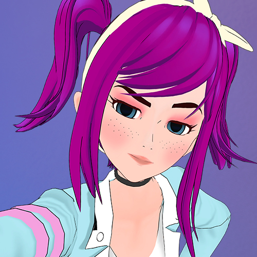She has vibrant purple hair in pigtails and a white bow headband and blue eyes with freckles and pink eyeshadow.