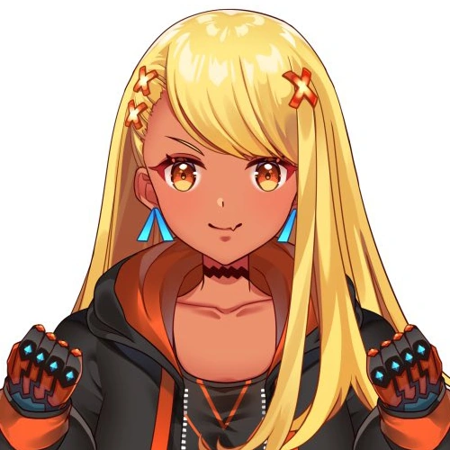 Qpi has the appearance of a tanned gyaru (黒ギャル, kuro gyaru?). She has long blonde hair, eyes with golden orange irises and tanned skin.