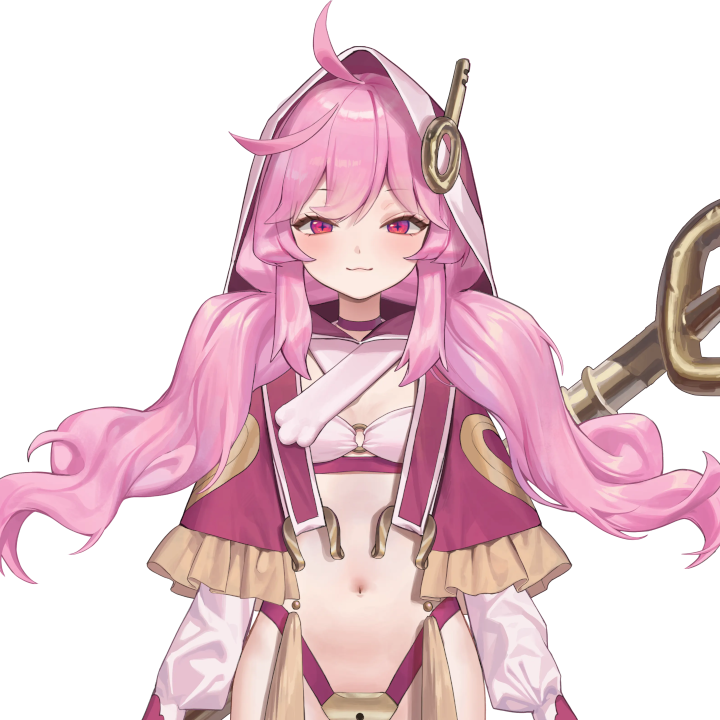 Kiki Lockheart is an elegantly fierce character with a striking, fantasy-inspired design. She possesses long, flowing twin tail pink hair thats, complementing her piercing pink eyes. Her outfit is a blend of regal and adventurous elements, featuring a hooded cape adorned with gold and pink accents. She wears a white top combined with a bikini-style bottom, both detailed with gold embellishments, suggesting a warrior's grace and a mystic's aura.