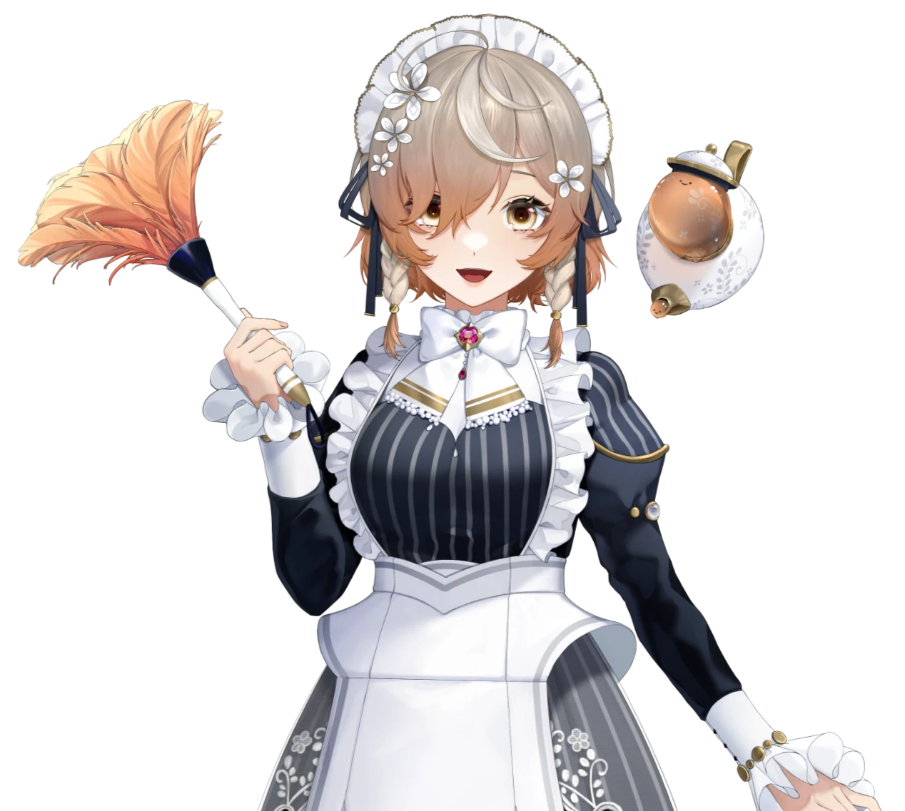 A Maid who occasionally works at the manor that is rumored to be haunted. Her teapot spirit companion contributes to the rumors, but she’s carefree and enjoys streaming games on her days off.[2]