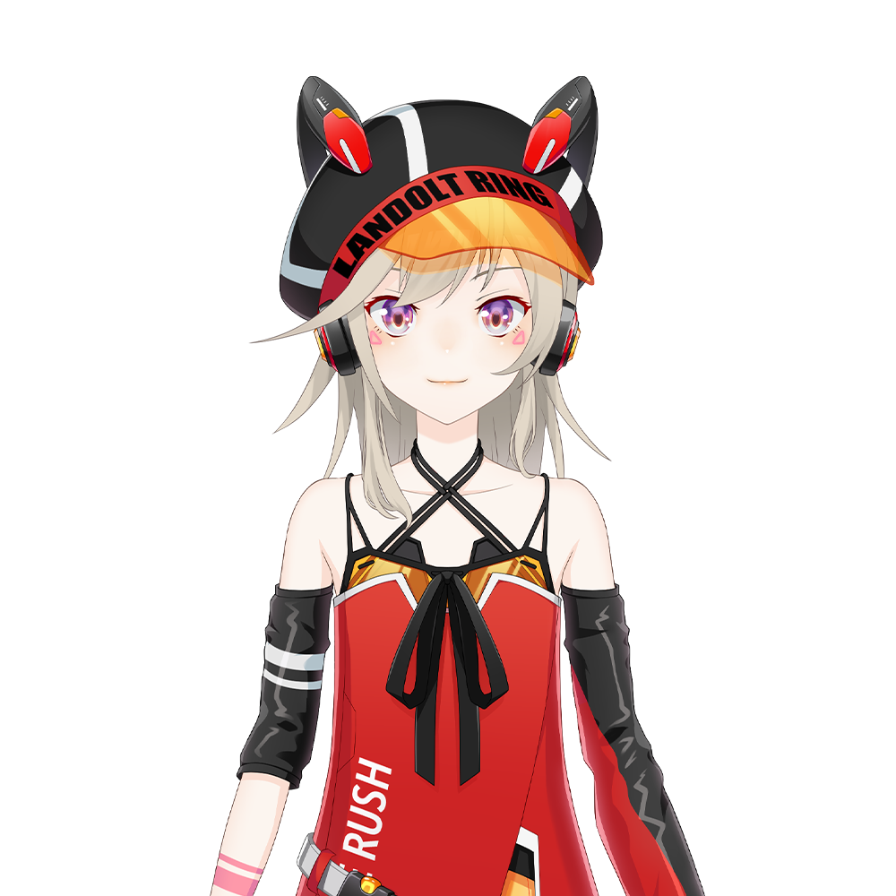 On her original VApArt design, she wore black and red headphones under a large black hat, with a red band emblazoned with the words "LANDOLT RING" and an orange visor. The hat had futuristic adornments in the shape of animal ears. On her body, she wore a sleeveless, orange one-piece short dress held up by black straps. This is transparent from her midsection to the skirt part, revealing black hot pants as her bottom piece. The orange dress is worn underneath a bright red fabric wrap, emblazoned on the right side with the words "AT ON_E RUSH", and secured by a white belt worn diagonally on her waist, plus adorned by a black ribbon on the chest. Her arms have asymmetrical detached black sleeves, longer on the left but with fingerless black gloves on the right. Her legs has a pair of asymmetrical black, red and white leggings, and a pair of sporty high cut black and red shoes with orange ankle guards.