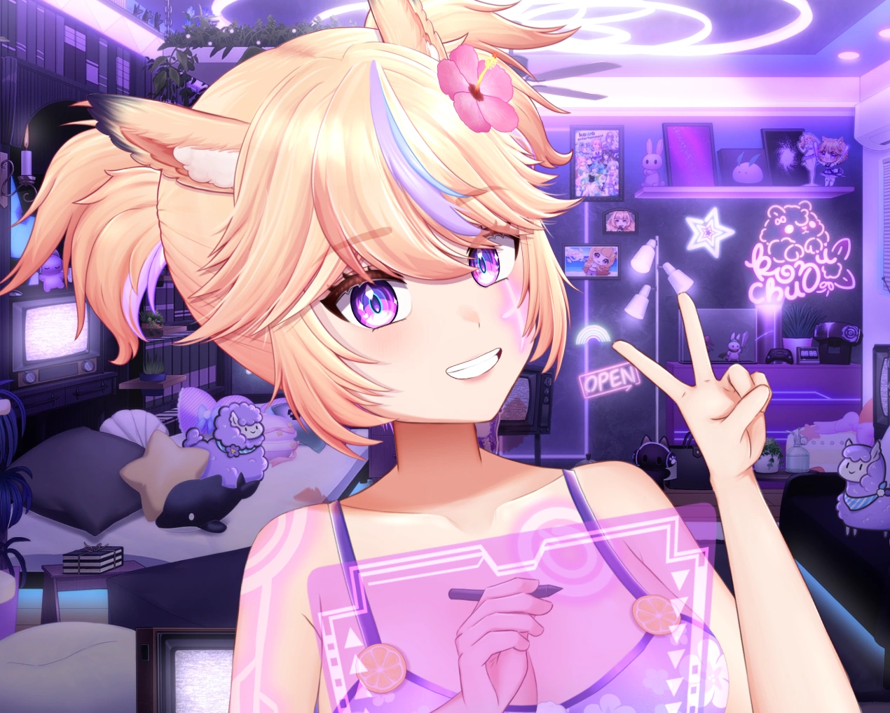 KoziiChu (コージーちゅ) is an English-language VTuber. She primarily streams on YouTube, and is known for her comfy style of streaming, as well as her skill in digital art and Live2D rigging.