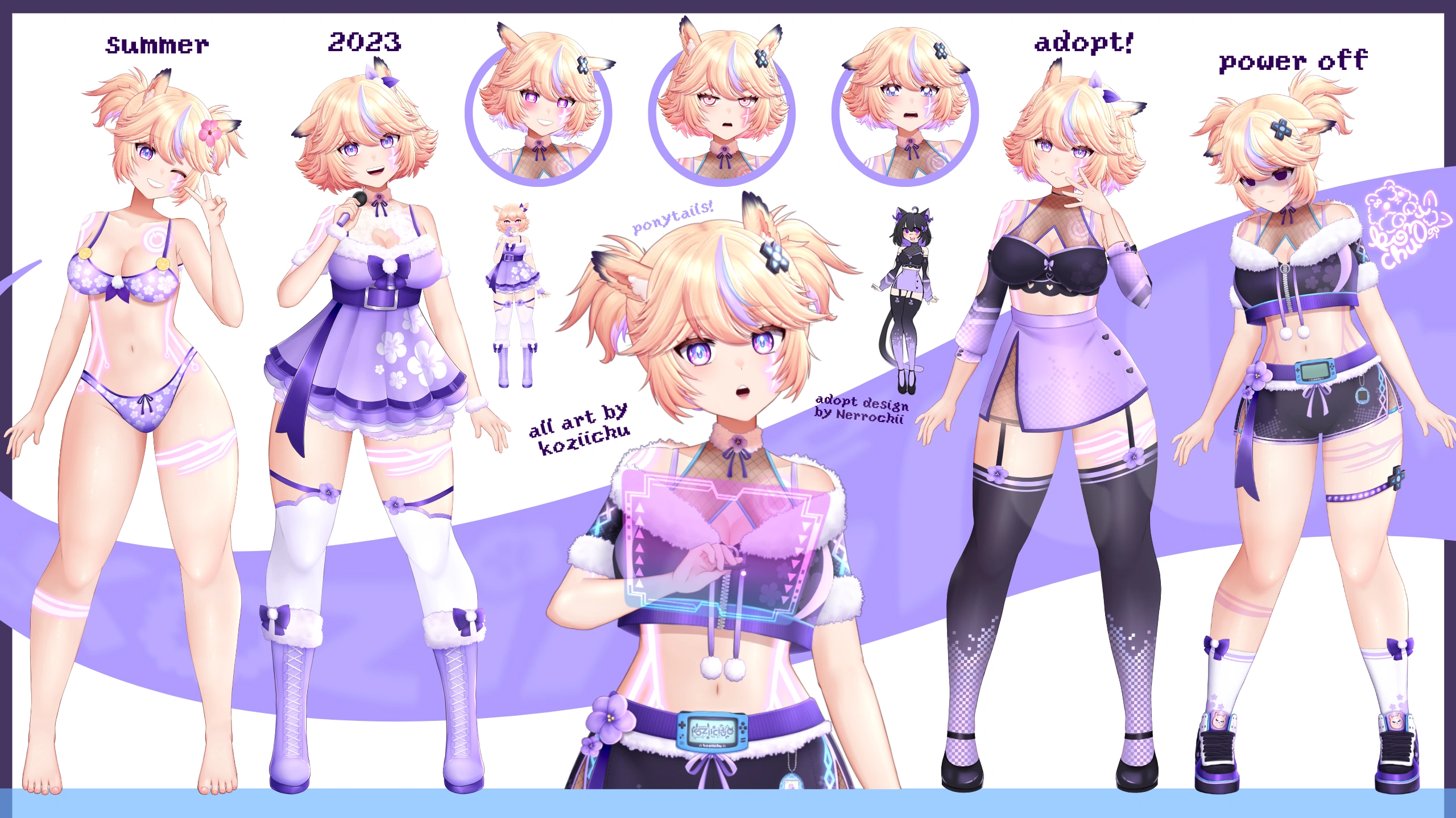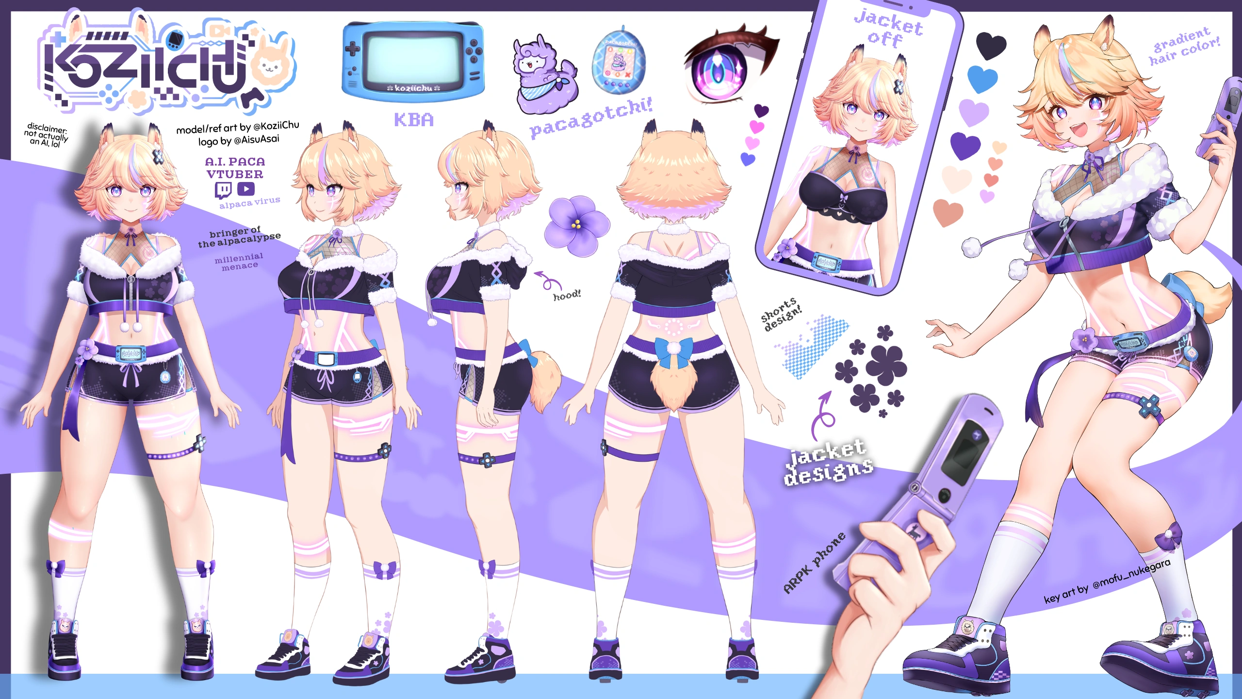 Kozii is a strawberry blonde digital-themed alpaca VTuber. Her main outfit is black and white, with purple and blue accents, as of March 2024, and includes African Violets (Baby Brian Variety), an edited version of the Gameboy Advance, her own Tamagotchi, and other gaming references. The Konami Code can be seen partially obscured on the band on her thigh. She has dark purple eyes, that fade into a light pink at the bottom, and a glowing blue lining the pupil. Her ears move up and down, like an alpaca's would in real life. She has a usually unseen fluffy tail behind her.