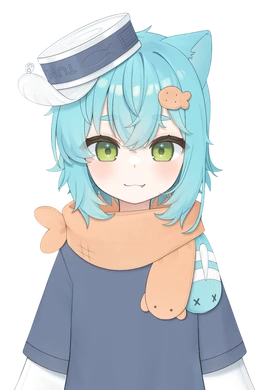 Krum has short turquoise hair, emerald green eyes and a fish biscuit hair clip. She wears a tuna can hat and a scarf with two fishes on each of its end, one orange and one blue with white stripes. There are also a lot of bandages on her legs and broken tail. She wears a long gray t-shirt with two cat paw patches and a pair of black short spats hidden under her shirt. Her detachable cat paws are attached to her short sleeves with a button. She also wears two different shoes, one with velcro straps and one with untied shoelaces.
