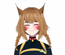 She has brown hair and braided pigtails with red eyes and markings on her cheek and sharp cat ears with the tips being thinner and a slightly darker shade than her hair.