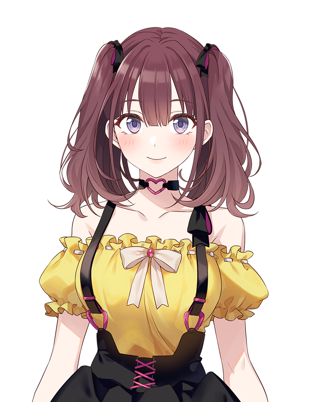 She has rosy brown hair in thick twintails with black hair ties and light purple eyes with a yellow off shoulder top and black suspender skirt.