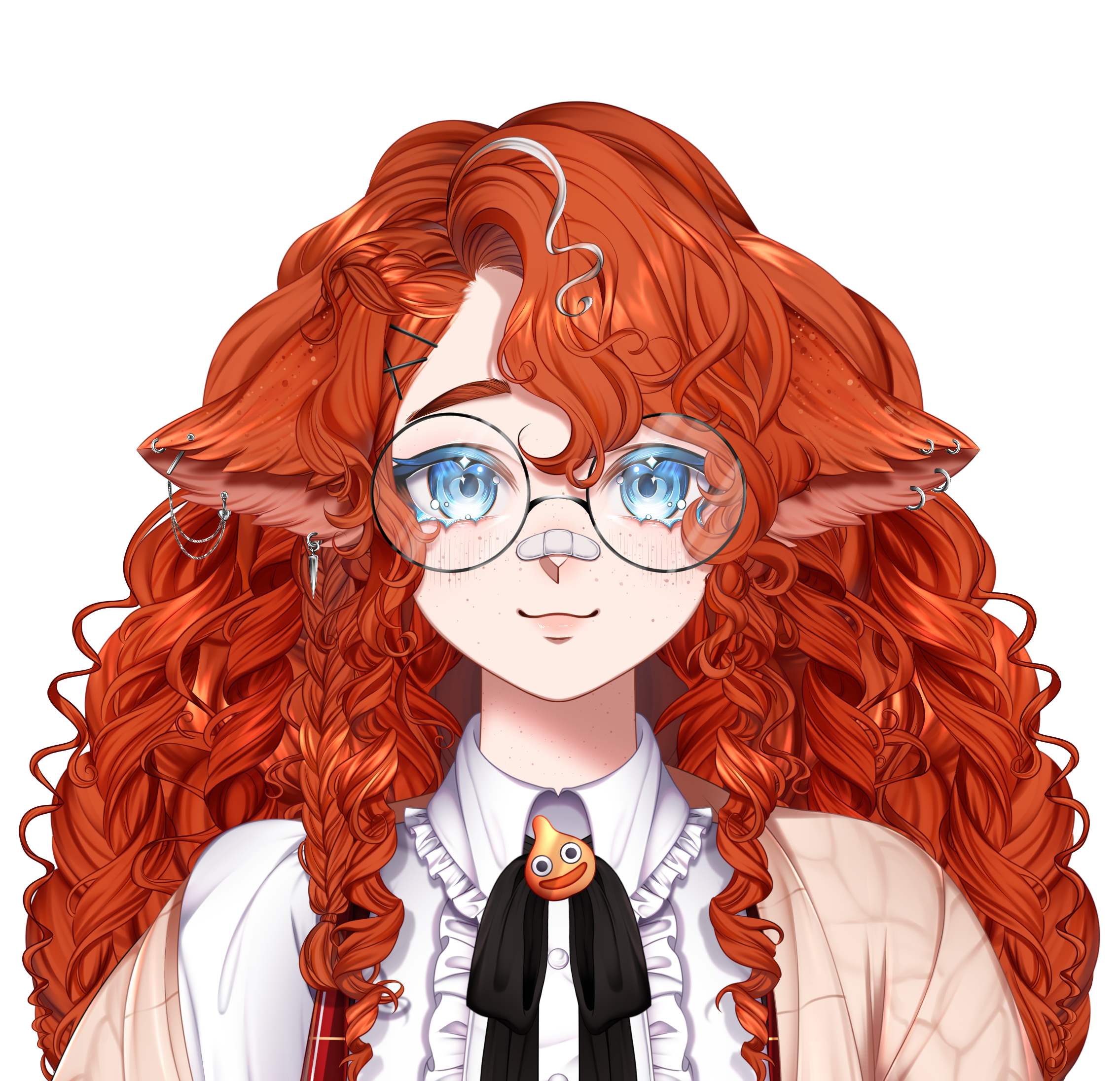 Lenox has long fluffy/curly ginger hair with pink streaks. They formerly had heterochromic eyes (blue left eye and orange right eye), but changed to both being blue to better reflect on their irl appearance. They have freckles on their cheeks and bridge of their nose and two hair clips, one featuring a Slime from the Dragon Quest series. They wear thin black-rimmed glasses and a plaster across their nose.