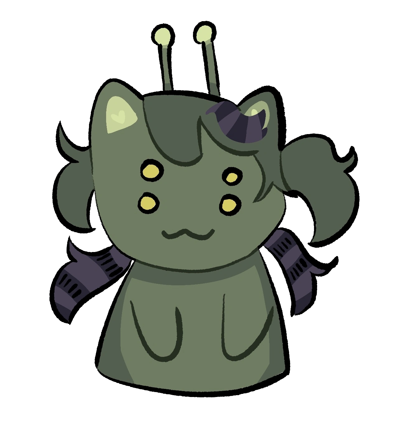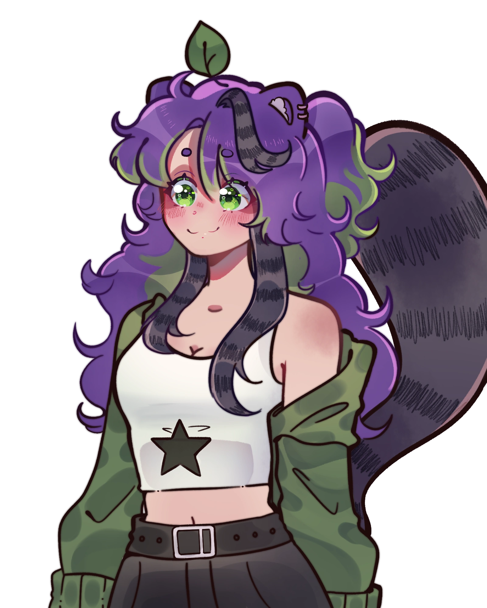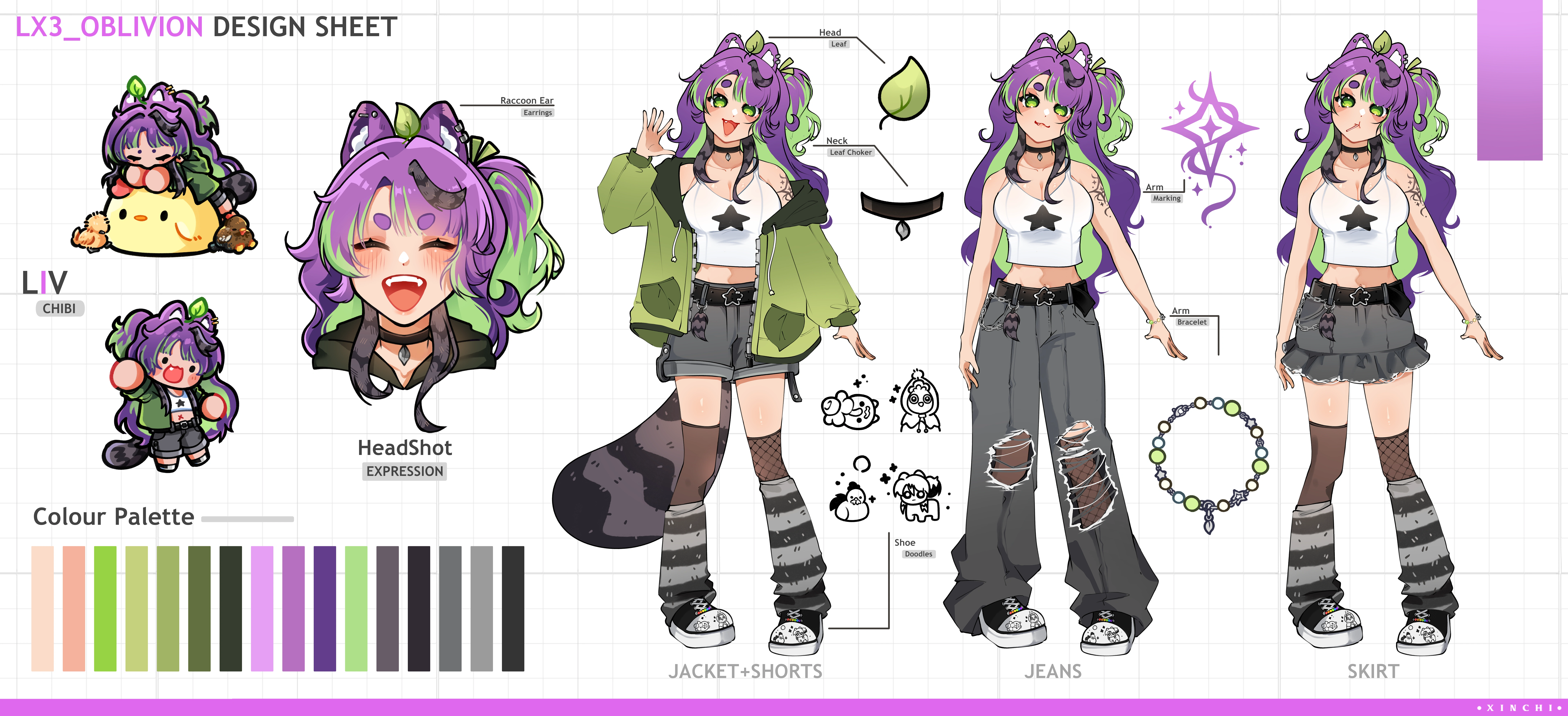 In Liv's human form, they maintain a feminine appearance with long, fluffy purple hair with green under-dye and 3 raccoon tails dyed in their hair. They have fangs, dark raccoon-like circles around their eyes, bright green eyes, and a star-shaped birthmark on their left shoulder. Liv typically wears a white tank top with a black star design and an olive-green unzipped hoodie. They wear mismatched thigh highs with striped leg-warmers. Their Black Converse Chucks have doodles of the Pokemon Smoliv, two chickens, and an autism creature (or TBH creature), and beads in rainbow colors as a reference to being part of the LGBTQ community. Liv prefers to wear black denim bottoms (shorts, ripped jeans, or mini-skirt).