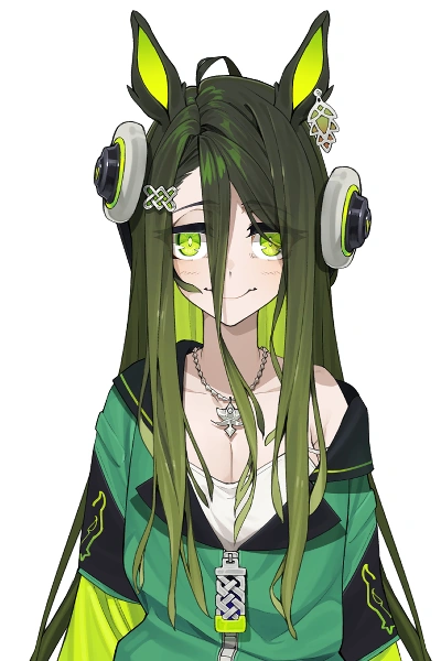 She has knee length kelp hair with a glowing light green on the under-side that also covers her face. Her eyes are bright neon green and yellow. Her teeth are pointy and sharp. She wears a unique tech-wear hoodie with silvery Celtic knot accessories. Her left horse ear has a silvery stained glass earring in reference to the anime Uma Musume. Her character consists of shades of green, neon yellow/green, teal, and dark blue.